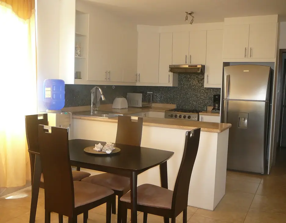 Cocina totalmente equipada, área abierta con sala de estar climatizada.